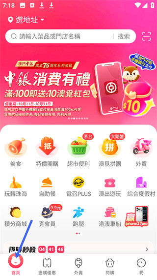 1、首頁有美食、特價團購等分類,開展中銀消費有禮活動,滿100送10澳覓紅包,還有限時秒殺等。