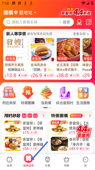 2、團購優惠頁面,可搜套餐,有新人專享價,麥當勞秒殺4.4折起,有限時秒殺、特價團購等優惠板塊。
