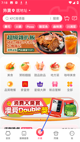 3、外賣頁面,能搜KFC肯德基等,有壽司、火鍋等品類,推出超級雜扒飯等招牌美食,還有消費大獎賞活動。