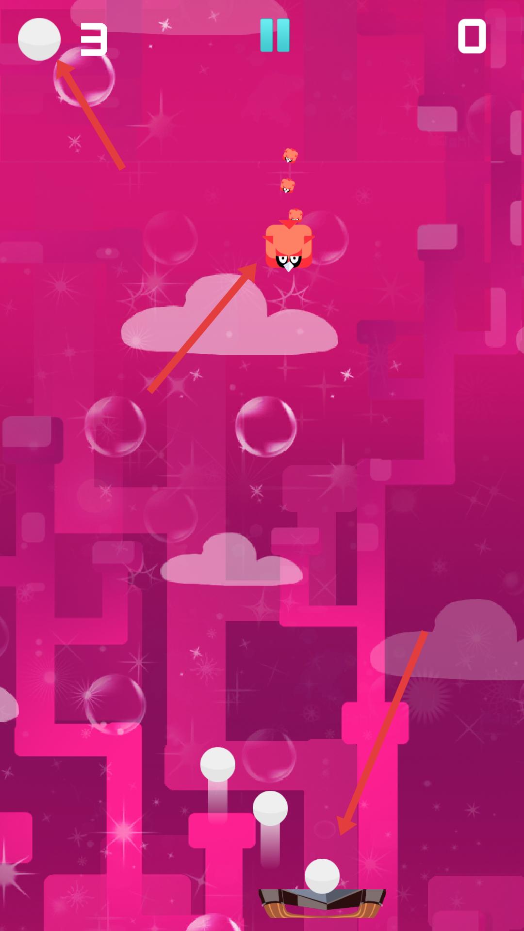 2、要操控彈弓,利用下方的白色球體等元素,擊中飛行的小鳥,同時注意避開障礙,收集分數。