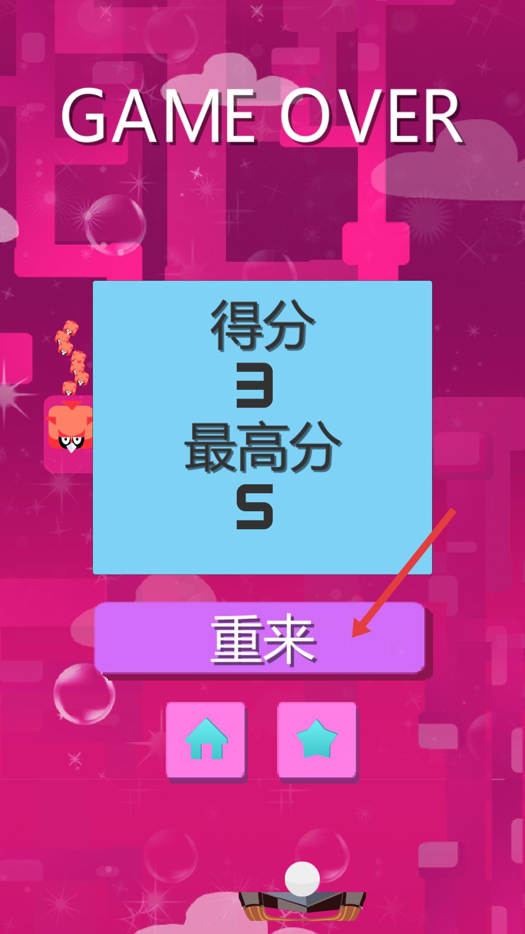 4、若游戲結束界面會顯示得分和最高分,此時點擊紫色的重來按鈕,可重新開始游戲,再次挑戰。