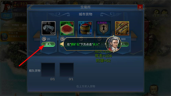 1、在交易所可買入銅礦石等城市貨物,豐富船隊貨物,提升船隊的攻擊、防御等屬性,助力航海貿易。