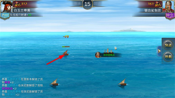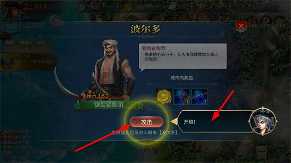 2、在波爾多等城市會遇到鋸齒鯊魚團等敵人,點擊攻擊即可開啟戰斗,擊敗敵人后可進入城市獲取獎勵。