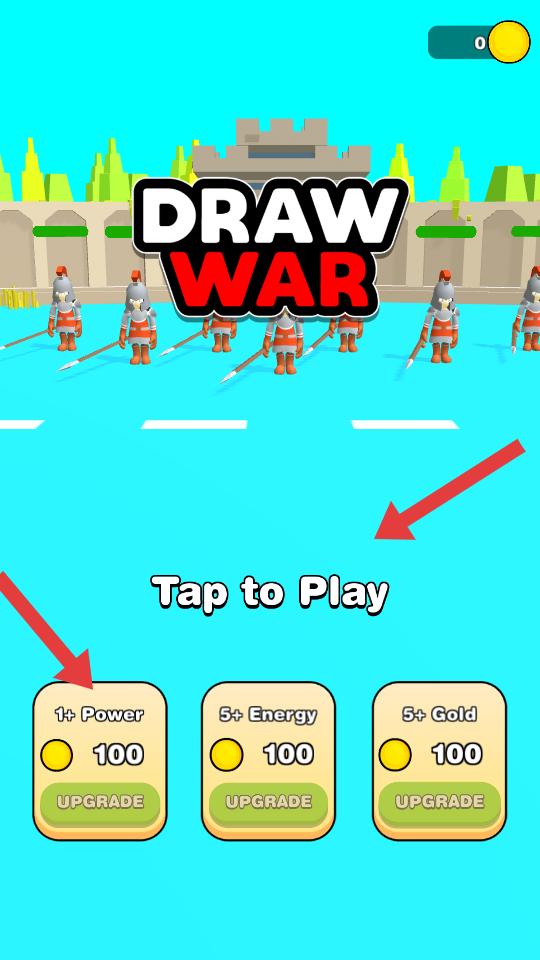1、進入游戲,看到DRAW WAR字樣,可花費金幣升級力量,能量,金幣等屬性,點擊Tap to Play,開啟游戲。