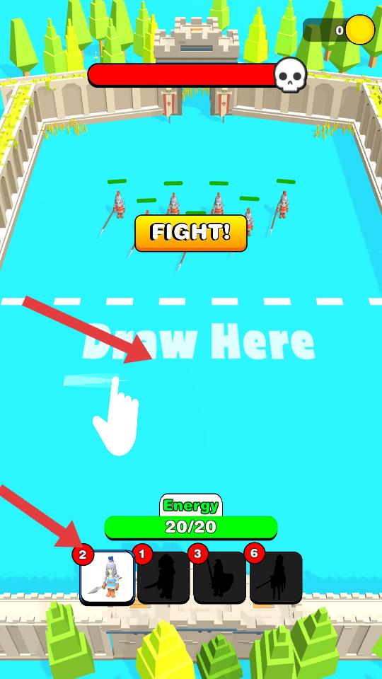 2、游戲里在Draw Here區域繪制,下方可選擇士兵,消耗能量召喚士兵,準備與敵人戰斗。