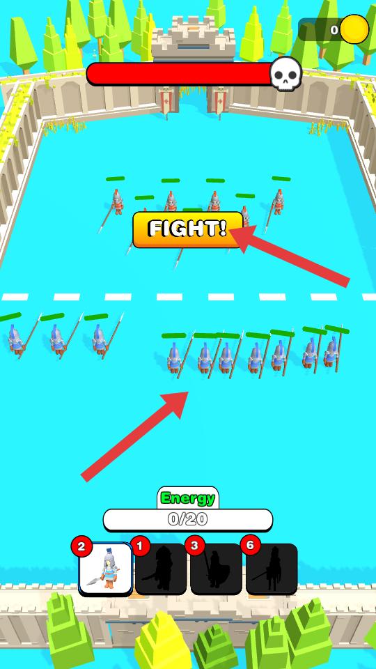 3、召喚好士兵后,點擊FIGHT按鈕,讓己方士兵與敵人交戰,通過戰斗擊敗敵人,推進游戲。