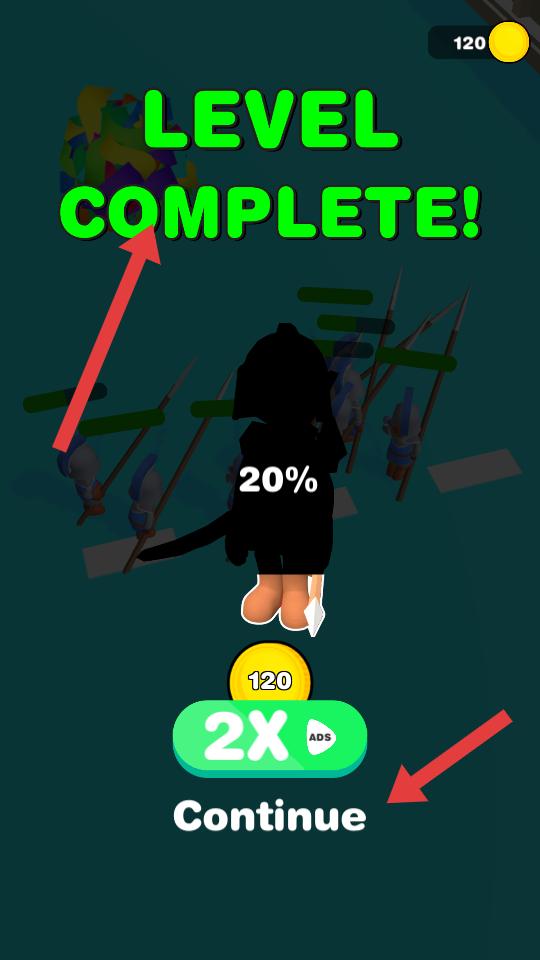 4、成功通關后,顯示LEVEL COMPLETE,獲得金幣獎勵,點擊Continue按鈕,可繼續游戲。