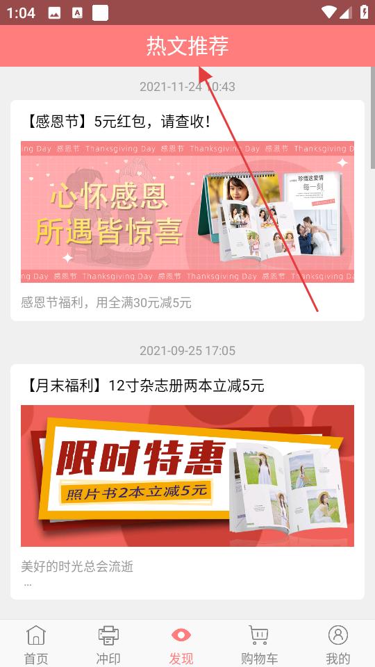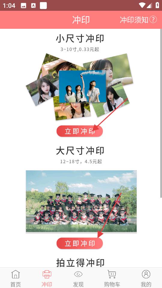 1、進入發現頁面,瀏覽熱文推薦了解福利活動,切換至沖印頁面,選擇小尺寸、大尺寸或拍立得沖印類型。