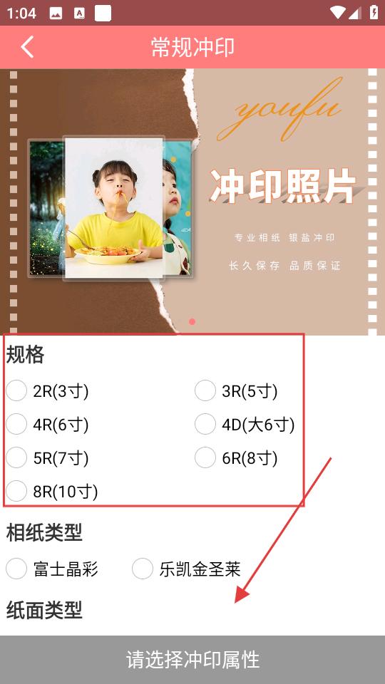 3、在常規沖印頁面,繼續選擇相紙類型、紙面類型,確認沖印屬性后,按提示上傳照片,完成沖印訂單提交流程。