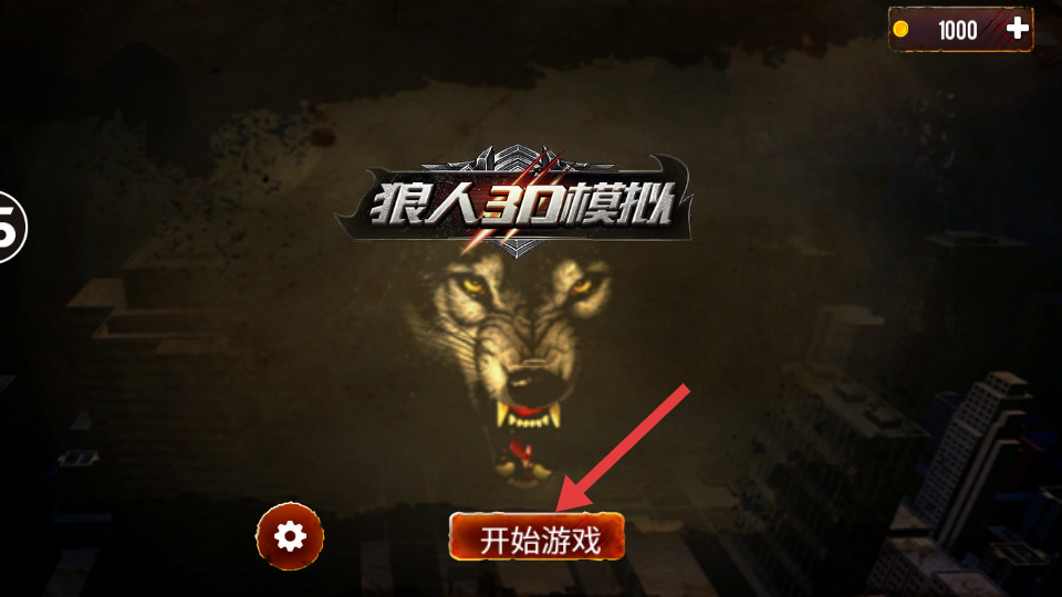 1、玩家進入游戲主界面,看到狼人3D模擬標題與狼頭形象,點擊開始游戲按鈕,即可開啟狼人模擬冒險。