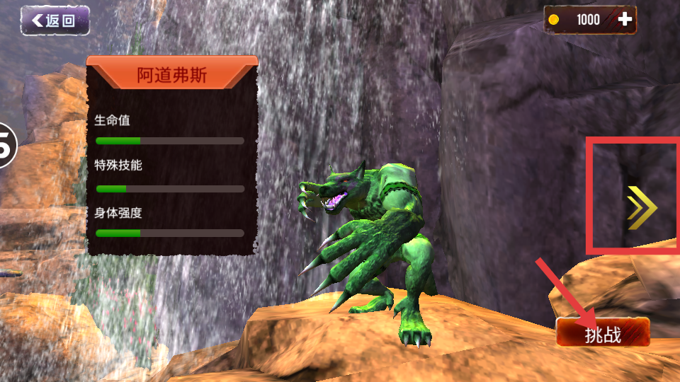 2、進入選擇角色界面,可查看阿道弗斯的生命值、特殊技能、身體強度等屬性,若滿意點擊挑戰按鈕,玩家即可進入戰斗場景。