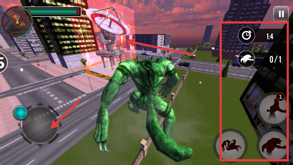 3、進入城市戰斗場景中,操作左側虛擬搖桿控制狼人移動,右側有技能按鈕和任務計時、進度顯示,朝著目標建筑前進,適時釋放技能完成任務。