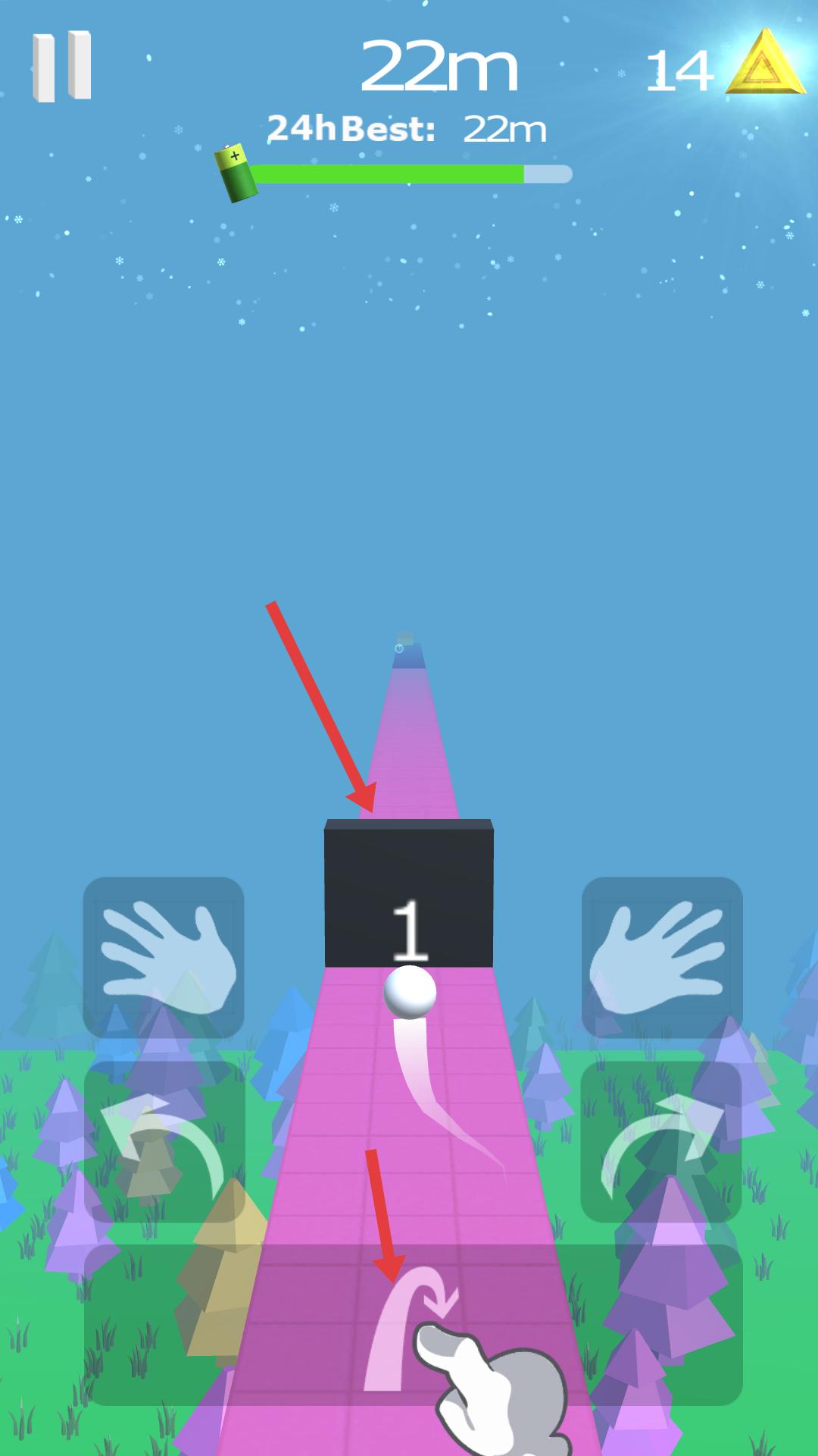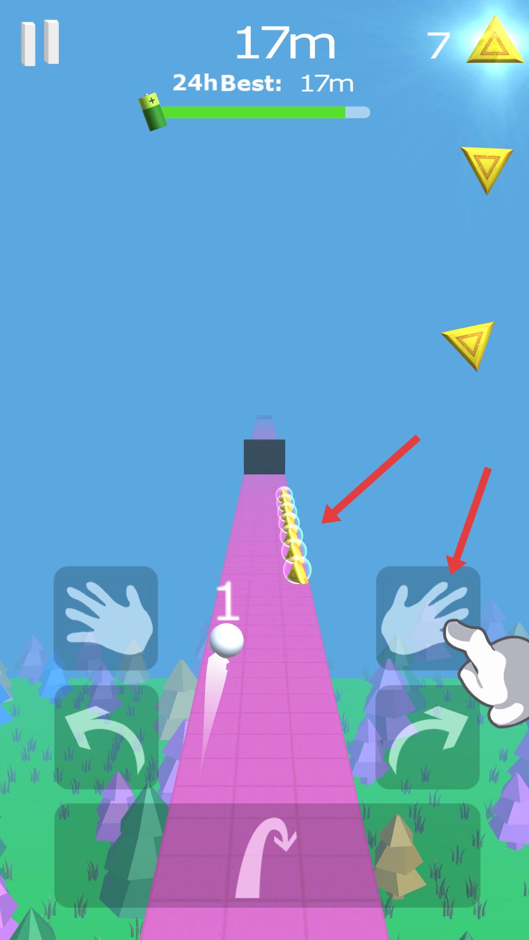 3、看到三角形道具時操控小球靠近,收集這些道具,它們也能為得分助力,操作時要靈活調整小球方向,確保順利收集。