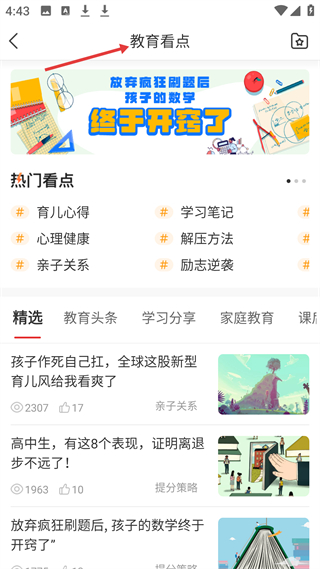 1、教育看點頁面,有熱門看點標簽,如育兒心得、心理健康等,還有精選文章,涵蓋親子關系、提分策略等,助力了解教育相關內容。