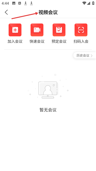 2、視頻會議頁面,可進行加入會議、快速會議、預定會議、掃碼入會等操作,當前暫無會議,方便開展線上交流。