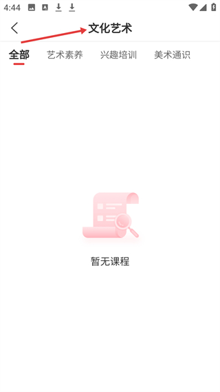 3、文化藝術頁面有藝術素養、興趣培訓、美術通識等分類,不過目前暫無課程,期待后續補充相關內容。