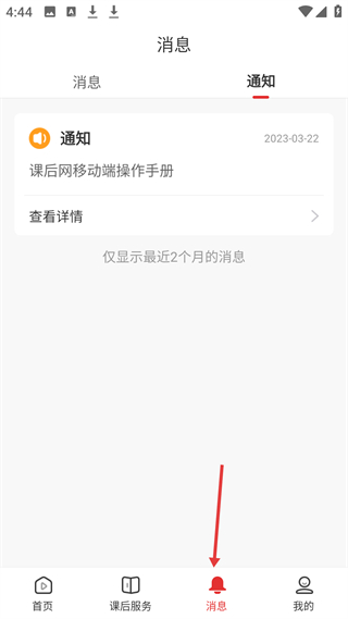 4、消息頁面處于通知標簽下,有課后網移動端操作手冊通知,可查看詳情,且僅顯示最近2個月的消息。