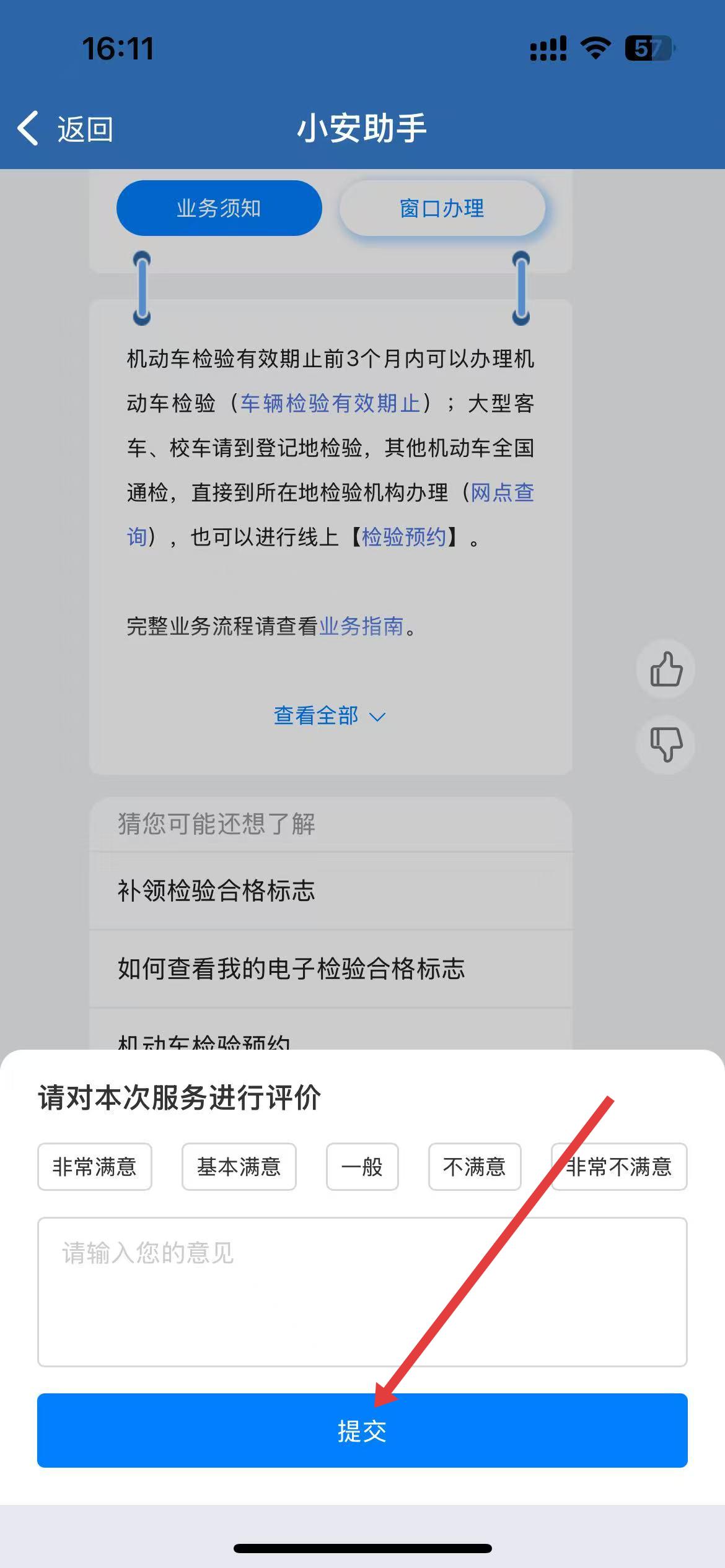 4、業務咨詢結束后可對服務進行評價,選擇滿意度并輸入意見后點擊提交,完成服務評價流程。