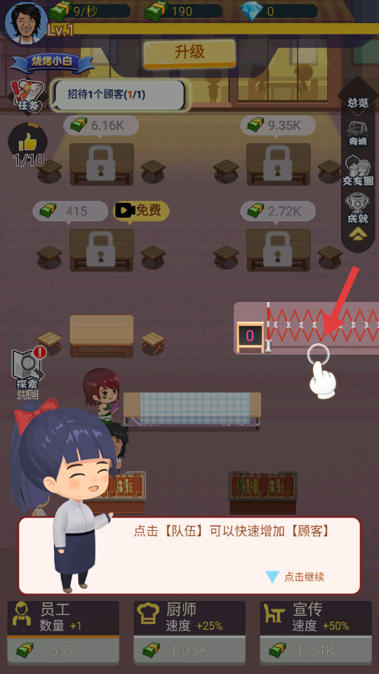 4、當需要更多客源時,點擊隊伍區域可快速增加顧客數量,顧客多了消費的機會就多,能有效提高店鋪的賺錢能力。