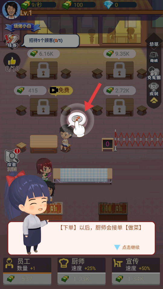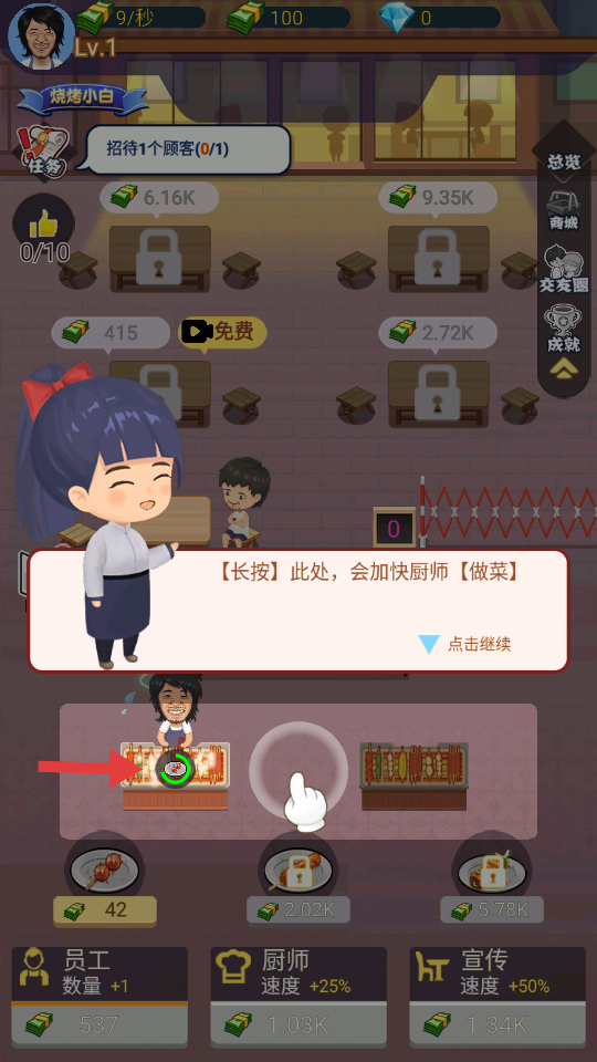 2、玩家在廚師做菜時長按指定位置,可加快做菜速度,讓菜品更快交付給顧客,提升出餐的效率,進而增加賺錢的速度。