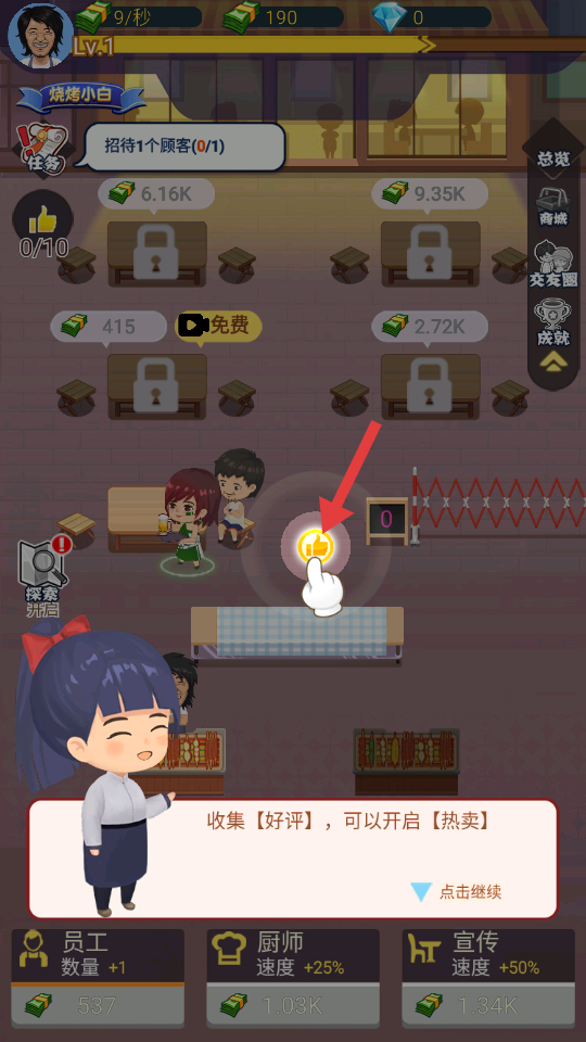 3、菜品給顧客后點擊好評按鈕收集好評,積累好評開啟熱賣模式,熱賣能吸引更多顧客,從而帶來更多收入。