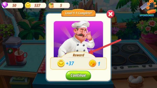 2、完成關卡后,會彈出獎勵界面,能得到金幣和鑰匙等獎勵,點擊Continue按鈕可繼續游戲。