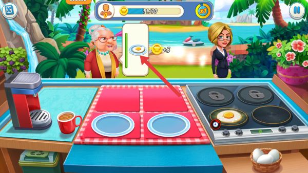1、烹飪場景要依據顧客需求制作美食,像煎蛋,成功制作后可獲得金幣,提升烹飪成果。