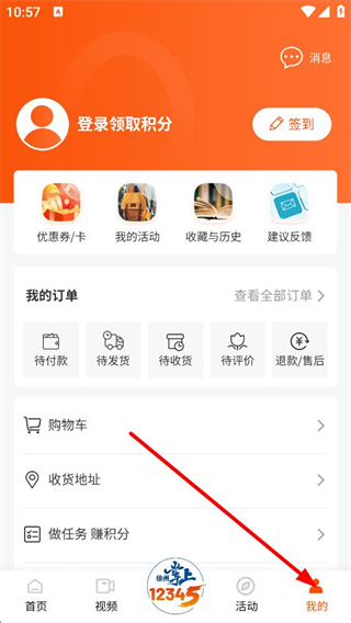 2、點擊底部我的按鈕,進入個人頁面,可進行登錄領取積分,使用優惠券、卡、我的活動等功能,還能管理訂單和購物車。