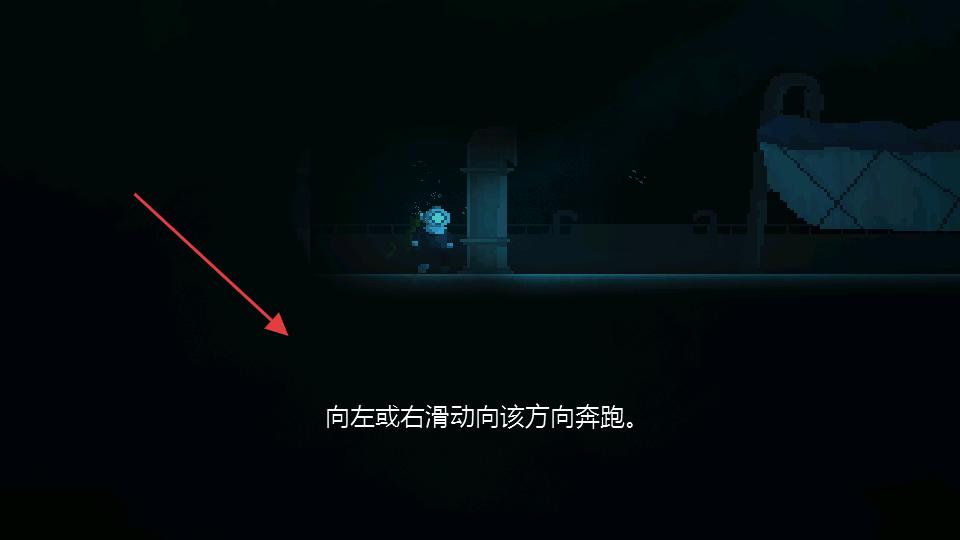2、游戲操作指引,向左或右滑動向該方向奔跑,按提示操作,讓角色在黑暗場景奔跑。