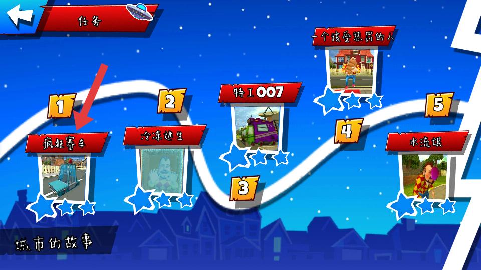 3、在城市的故事任務列表里,有瘋狂賽車等不同任務關卡,選擇瘋狂賽車關卡,就能進入對應的賽車任務場景。