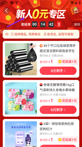 3、新人0元專區,有限時活動商品,支付1元后返1元,含日用品,需按領券購買返現的流程操作。