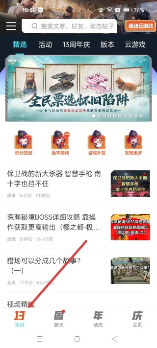 3、逆戰游戲助手首頁,可瀏覽精選、活動等板塊,查看積分簽到、版本福利等功能入口,獲取游戲資訊和攻略。