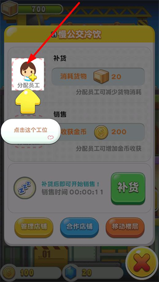 4、進入店鋪管理界面,點擊分配員工的工位,分配員工后能減少貨物消耗或增加金幣收獲,之后進行補貨,即可開始銷售獲取收益。
