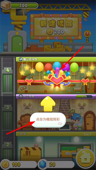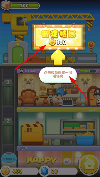 1、花費100金幣點擊樓頂,就能修建一層毛坯房,拓展店鋪的樓層空間,推進建筑進度。