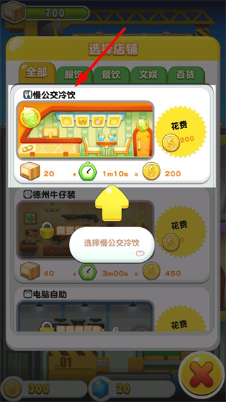 2、挑選慢公交冷飲店鋪,花費20物資和200金幣,等待1分10秒,即可解鎖該店鋪,豐富經營的業態。