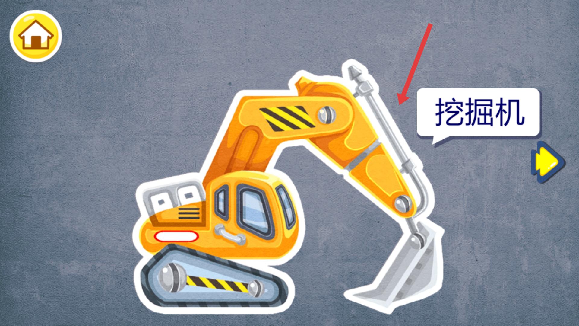2、進入游戲后會展示工程車圖片,比如挖掘機,同時顯示名稱,幫助玩家認識工程車。