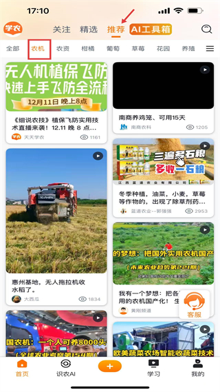 1、進入學農農機版塊,可查看無人機植保、無人拖拉機收稻等內容,含直播預告與農機技術分享,助力了解農業機械化相關知識。