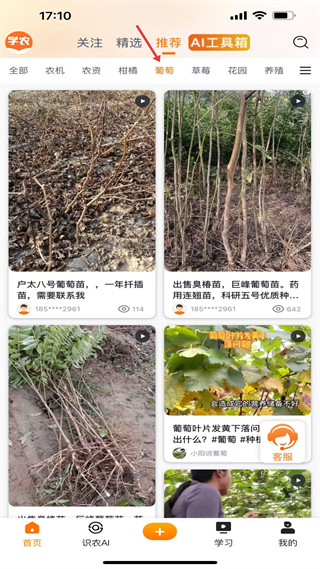 4、進入葡萄版塊,能瀏覽葡萄苗供應、葉片黃化等內容,含種植技術與種苗資源信息,助力葡萄種植的管理與資源獲取。